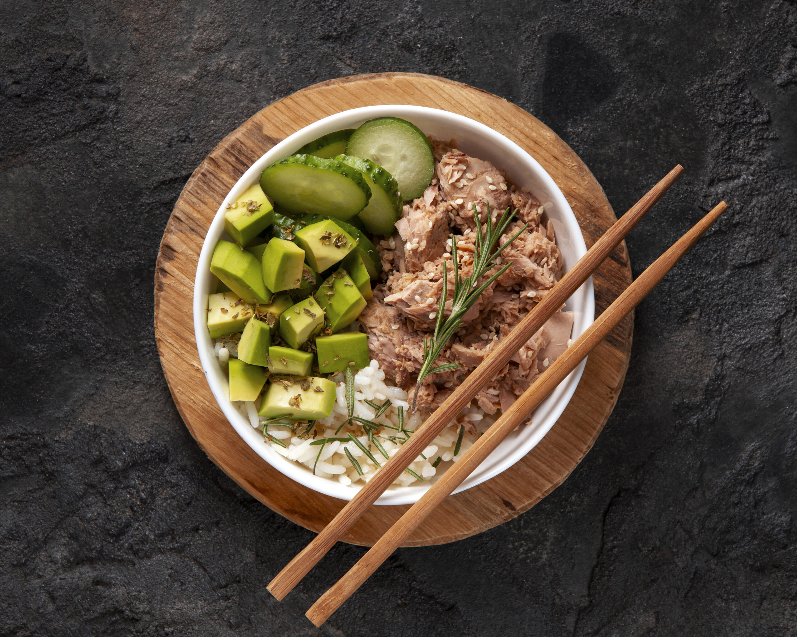 Cubos de atum, cream cheese, abacate, manga e pepino