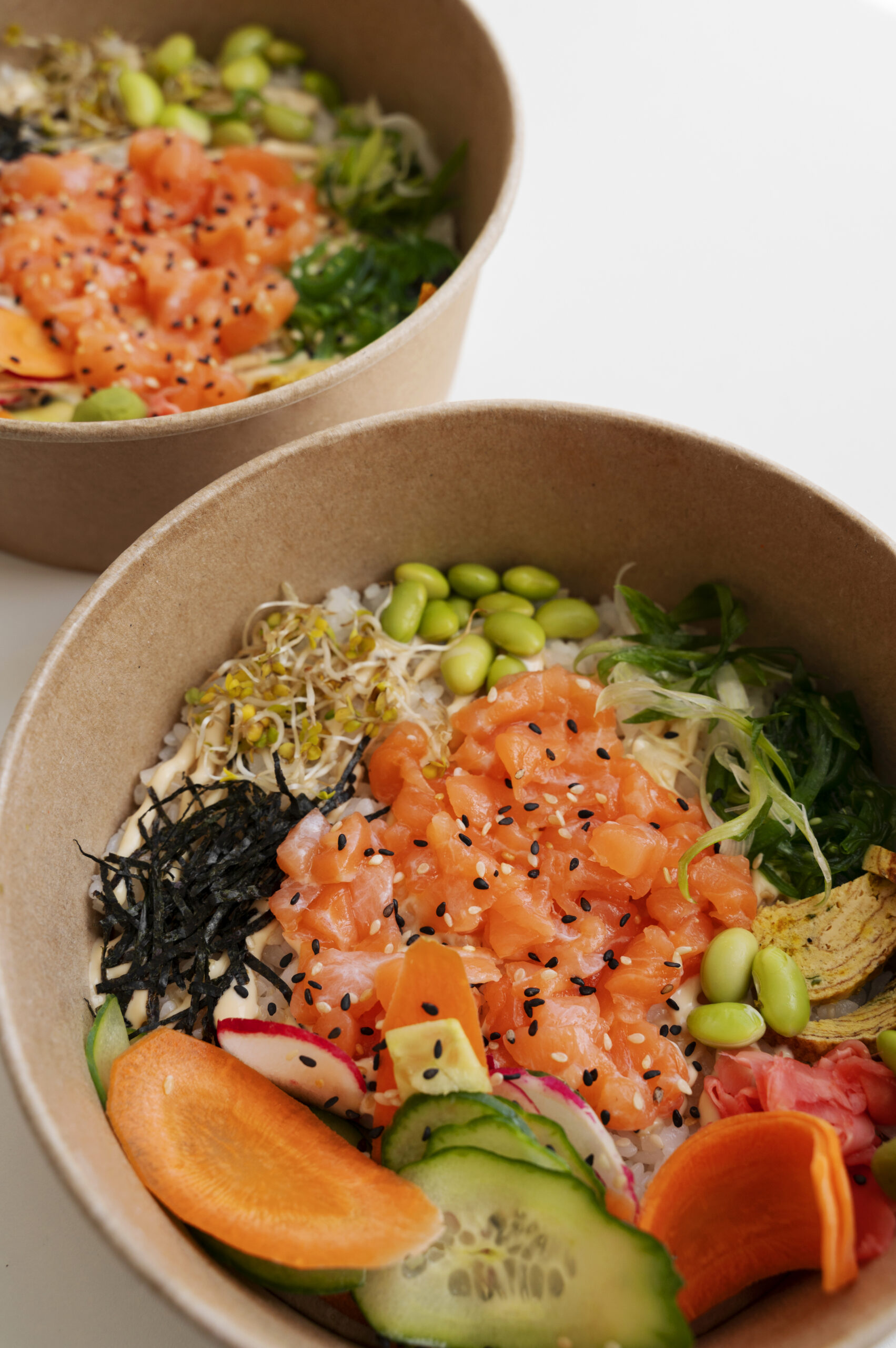 Cubos de salmão, cream cheese, abacate, manga e pepino